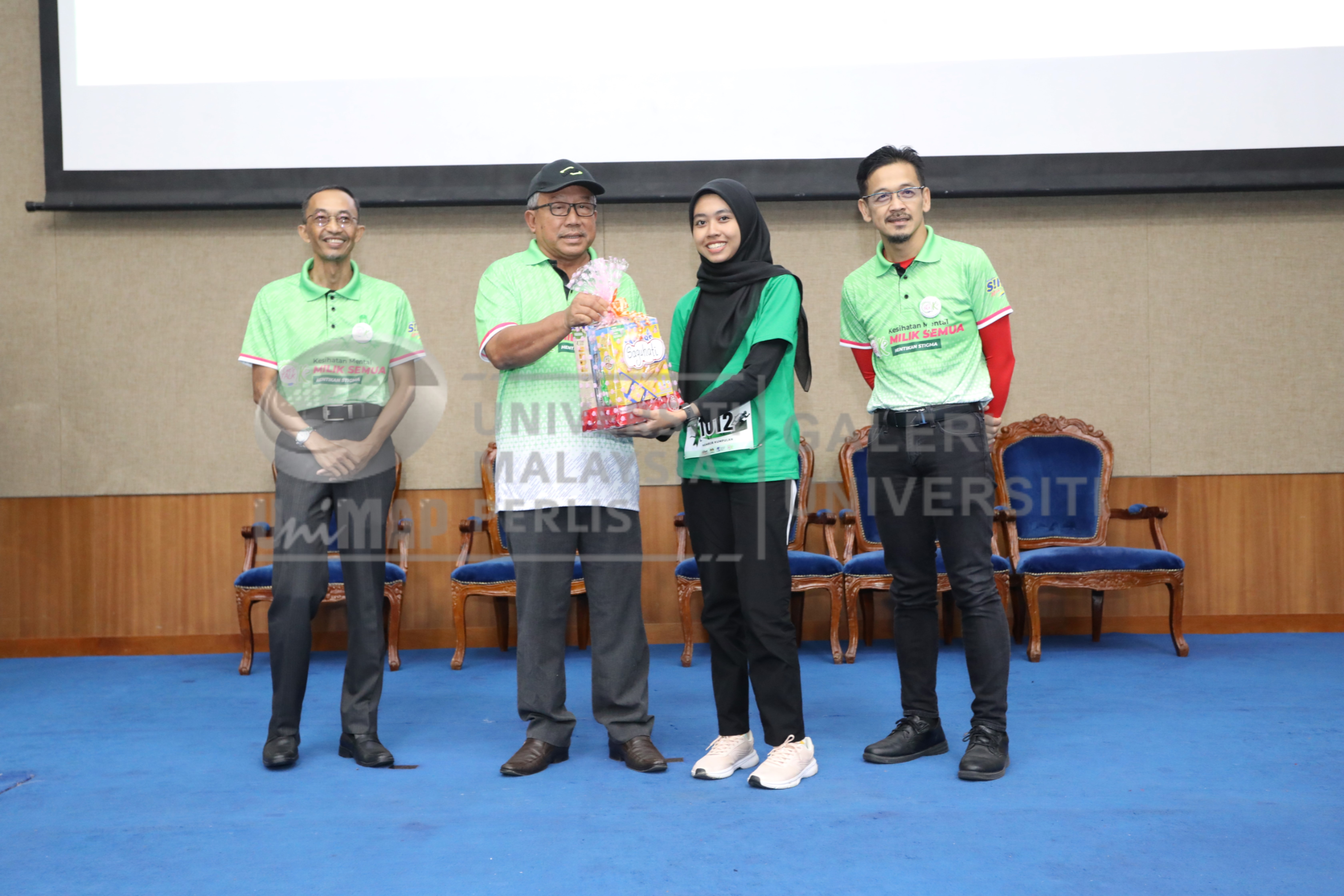 Abstract: YB Tuan Megat Hashirat Bin Hassan, ADUN Pauh menyampaikan hadiah saguhati kepada peserta yang menyertai pertandingan yang dianjurkan sempena Program Hari Kesihatan Mental 2023 di Dewan Kecemerlangan, Kampus Alam UniMAP, Pauh Putra pada 15 Oktober 2023. Turut berada di atas pentas, Dr. Ismuni Bin Bohari, Pengarah Kesihatan Negeri Perlis dan Encik Rusdi Bin Puteh, Bendahari UniMAP,