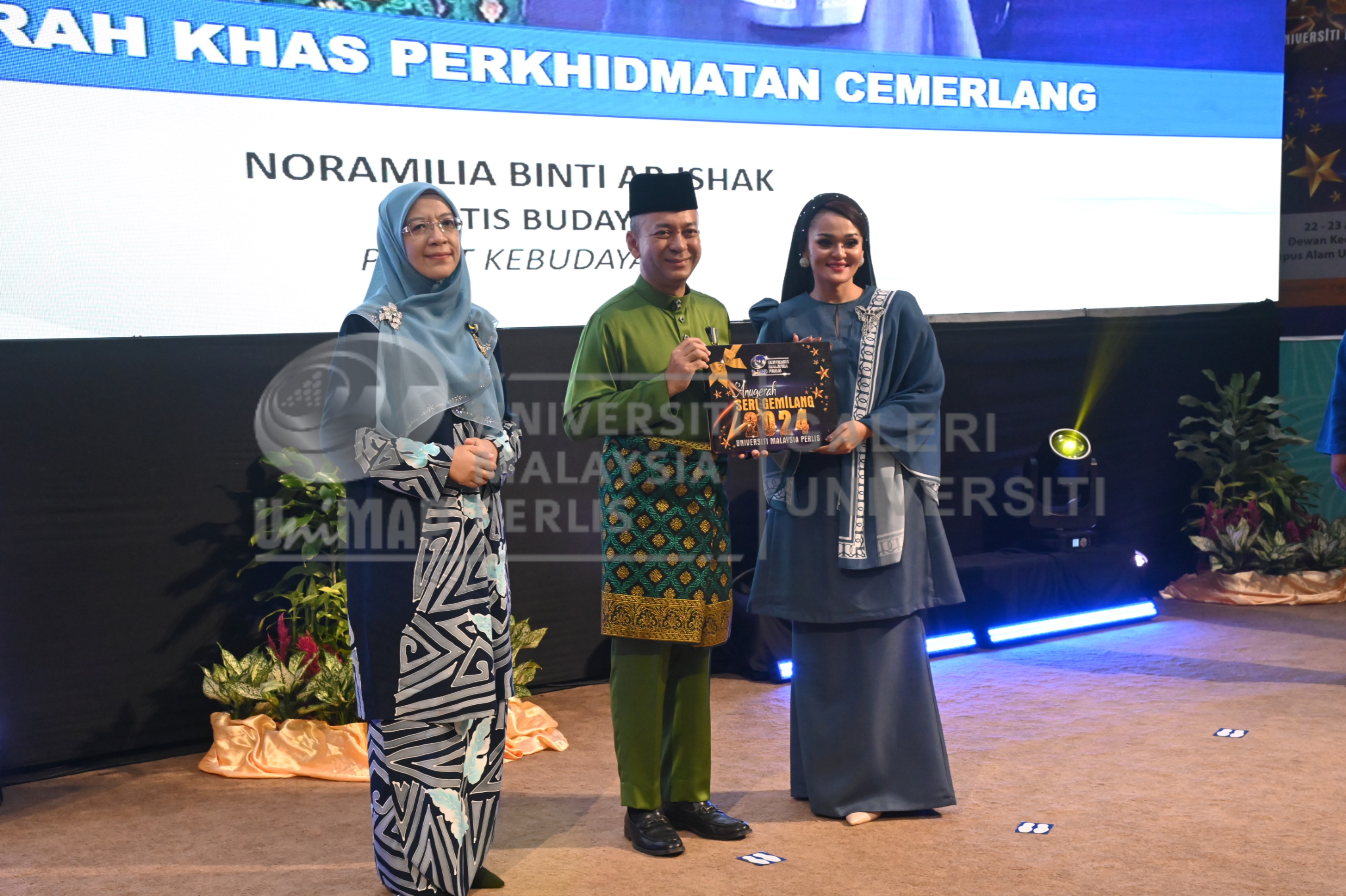 Abstract: Yang Berbahagia Dato' Prof. Ts. Dr. Zaliman Sauli, Naib Canselor UniMAP menyampaikan Anugerah Khas Perkhidmatan Cemerlang kepada Puan Noramilia Binti Ab Ishak, Artis Budaya, sempena Majlis Anugerah Seri Gemilang 2024 yang berlangsung pada 23 April 2025 di Dewan Kecemerlangan, Kompleks Dewan Kuliah, Kampus Alam UniMAP.