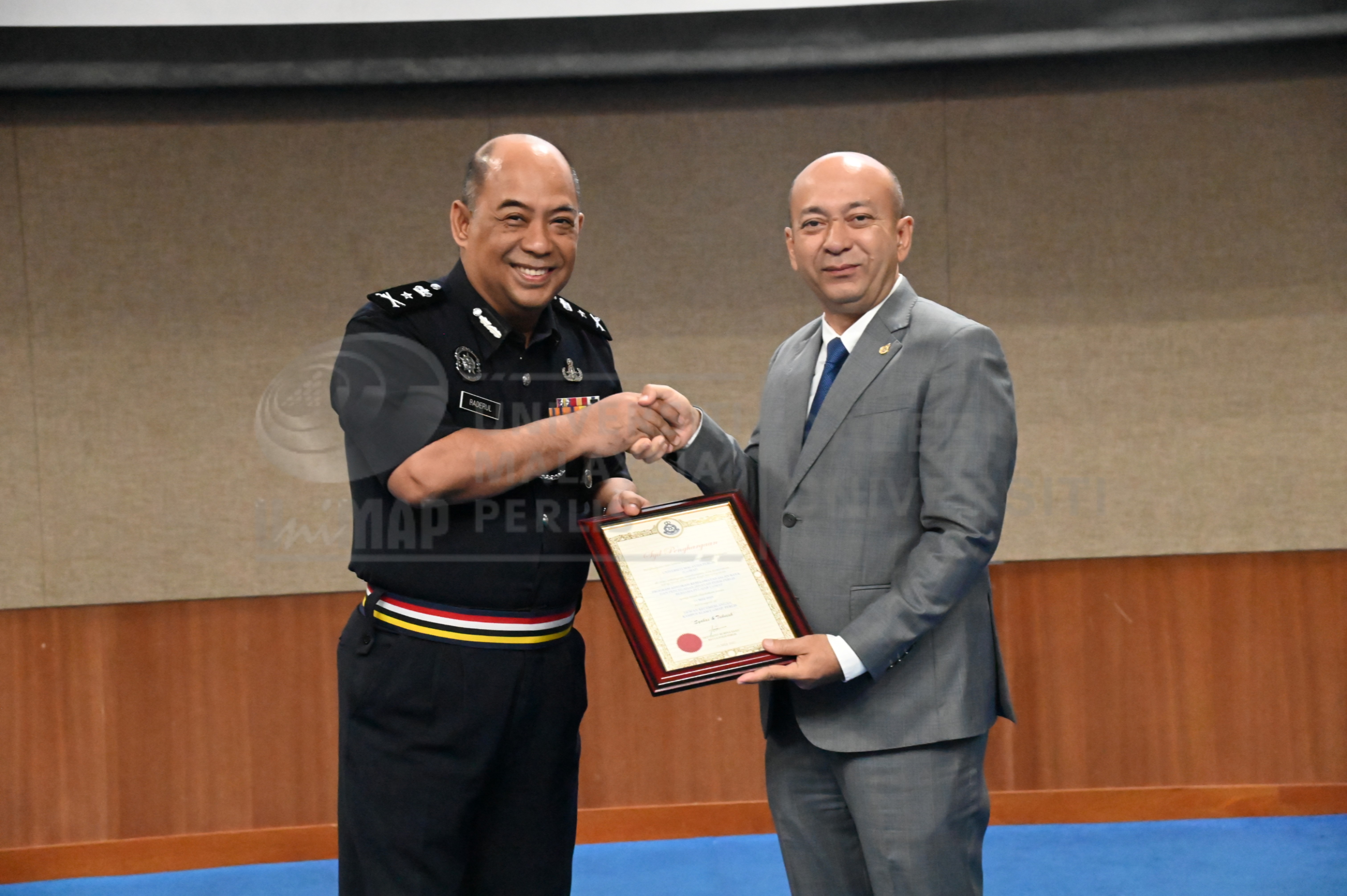 Abstract: YDH SAC Tuan Baderulhisham bin Baharudin, Timbalan Ketua Polis Perlis menyerahkan sijil penghargaan kepada YBhg. Prof. Dato' Ts. Dr. Zaliman Sauli, Naib Canselor UniMAP diatas kerjasama menjayakan Program Advokasi Keselamatan dan Pencegahan Jenayah PDRM Perlis.