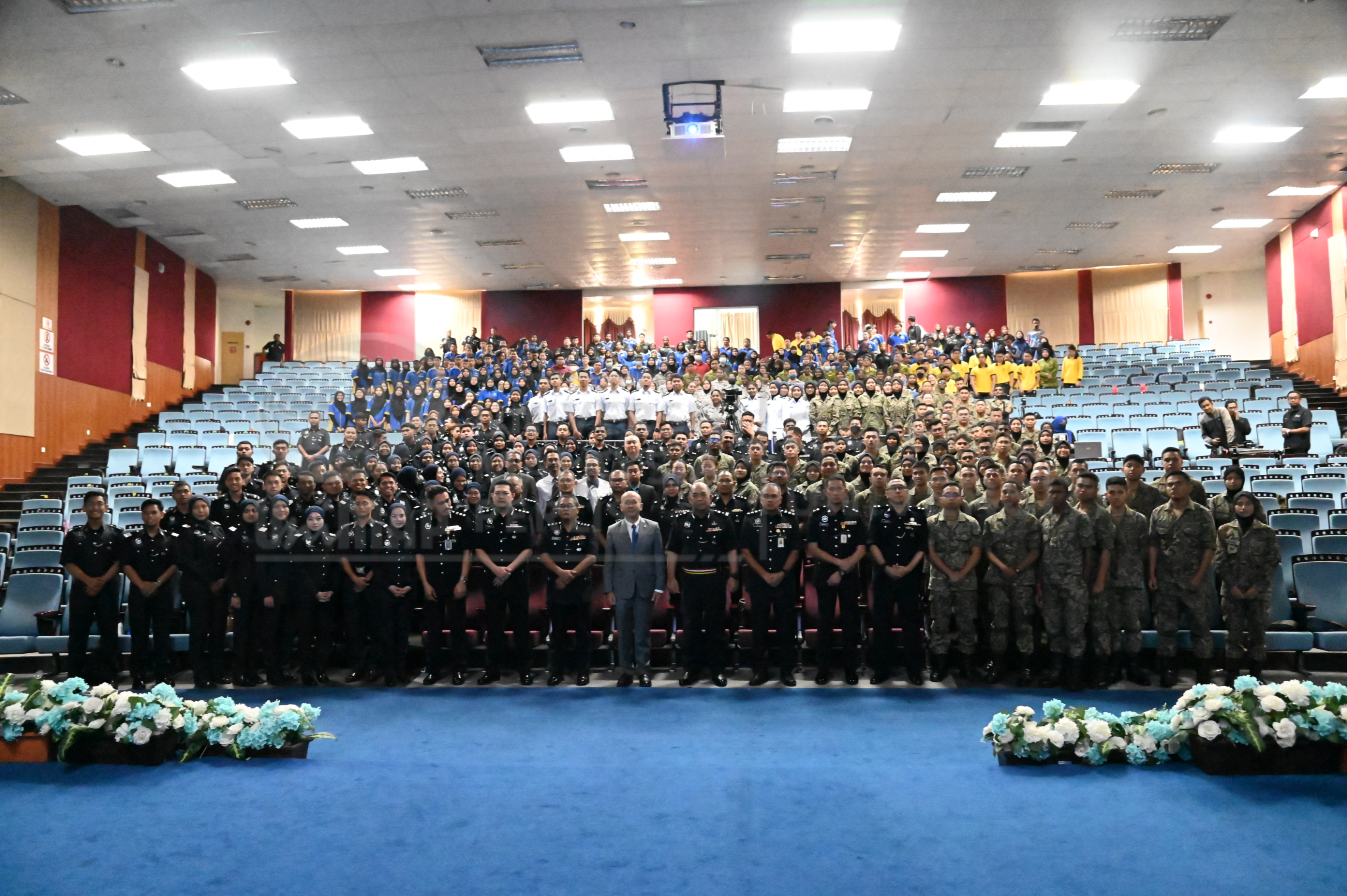 Abstract: YBhg. Prof. Dato' Ts. Dr. Zaliman Sauli, Naib Canselor UniMAP dan YDH SAC Tuan Baderulhisham bin Baharudin, Timbalan Ketua Polis Perlis bergambar kenangan-kenangan bersama peserta yang hadir ke Program Advokasi Keselamatan dan Pencegahan Jenayah PDRM Perlis, di Dewan Kecemerlangan UniMAP , Arau, Perlis pada 11 Mei 2023.