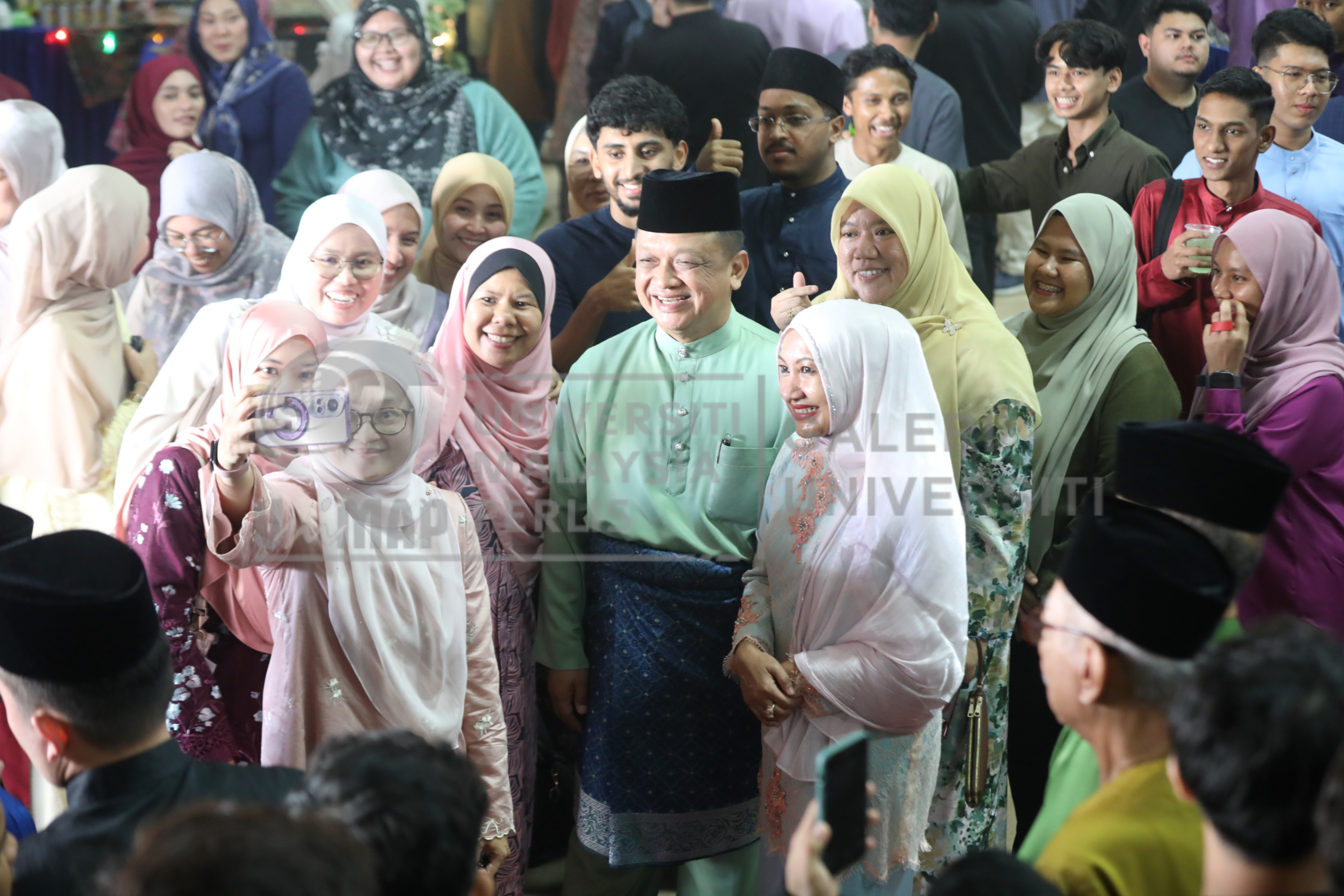 Abstract: Staf dan pelajar UniMAP yang hadir ke Majlis Riang Ria Raya@UniMAP 2025 tidak melepaskan peluang untuk berswafoto bersama DYTM Tuanku Syed Faizuddin Putra Ibni Tuanku Syed Sirajuddin Jamalullil, Raja Muda Perlis merangkap Tuanku Canselor UniMAP dan DYTM Tuanku Dr. Hajah Lailatul Shahreen Akashah Khalil, Raja Puan Muda Perlis merangkap Tuanku Pro-Canselor UnMAP di Dewan Ilmu, Kampus Alam UniMAP, Pauh Putra.