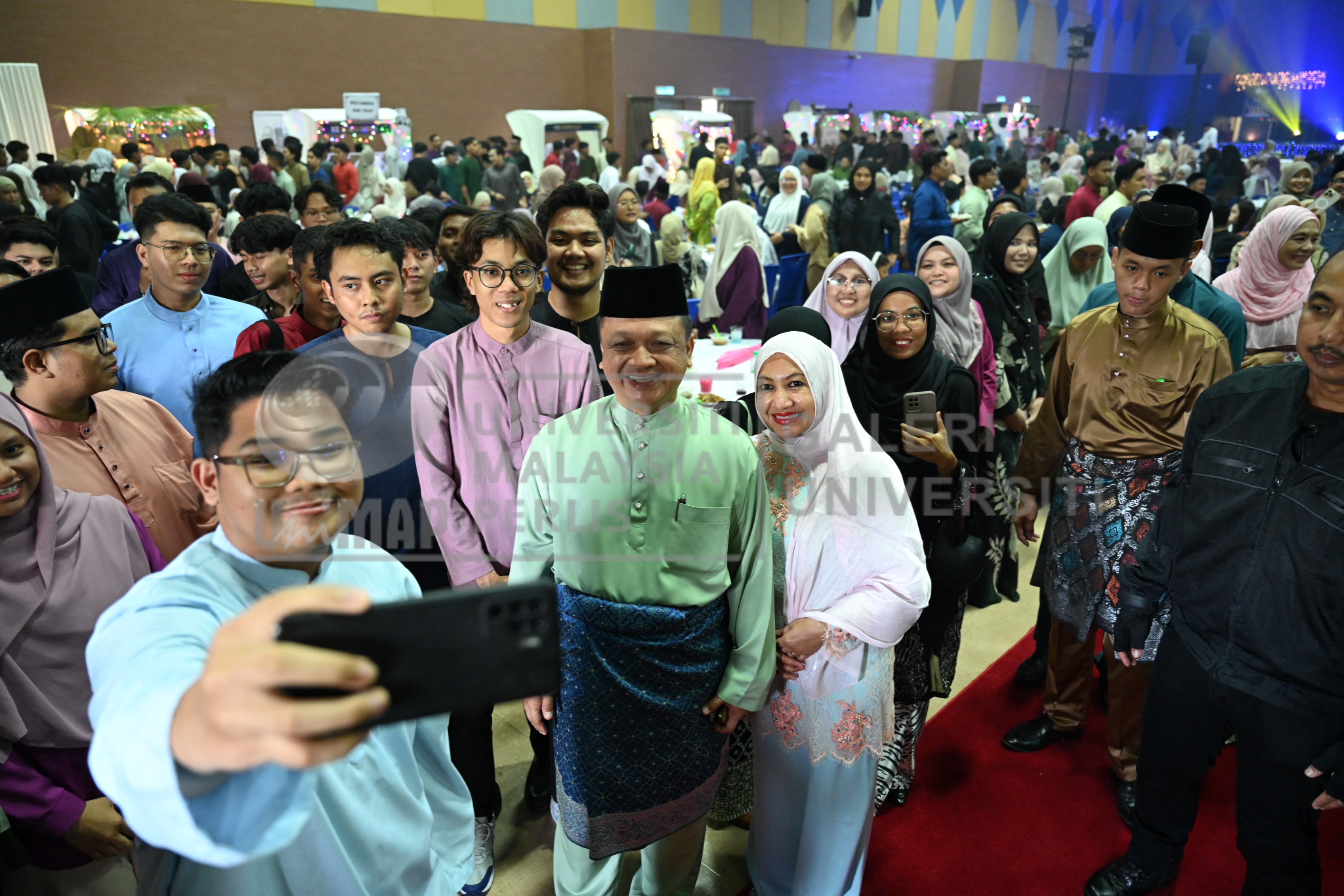 Abstract: Pelajar UniMAP tidak melepaskan peluang berswafoto bersama DYTM Tuanku Syed Faizuddin Putra Ibni Tuanku Syed Sirajuddin Jamalullil, Canselor UniMAP dan DYTM Tuanku Dr. Hajah Lailatul Shahreen Akashah Khalil semasa Majlis Riang Ria Raya@UniMAP 2025 di Dewan Ilmu, UniMAP.
