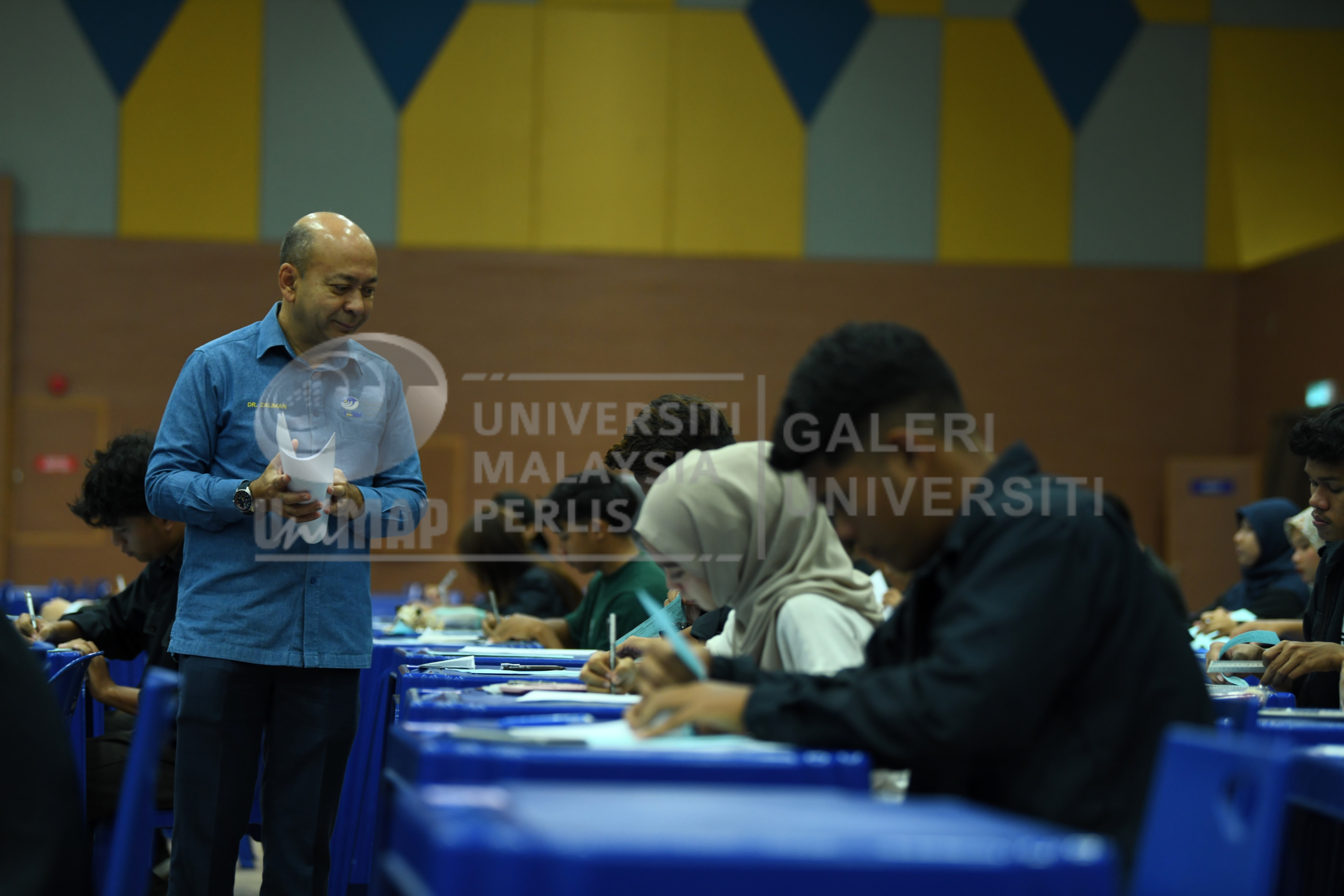 Abstract: YBhg. Dato' Prof. Ts. Dr. Zaliman Sauli, Naib Canselor UniMAP sedang memantau perjalanan peperiksaan di Dewan Ilmu sempena Peperiksaan Akhir Semester Pertama Program Diploma Sidang Akademik 2025/2026.